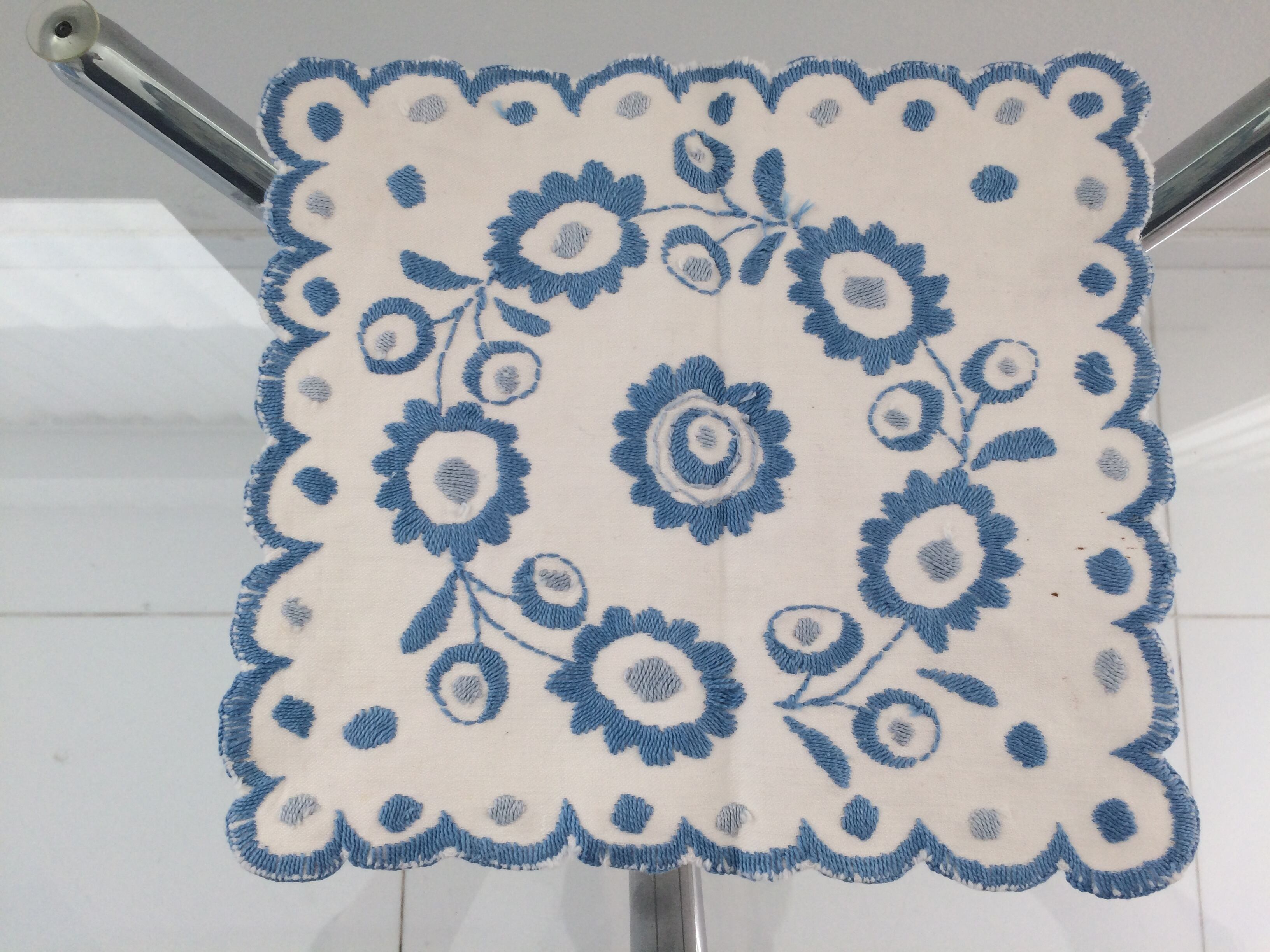 英国:ベビーブルーの刺繍がとても優雅です。ほぼ正方形なので使い勝手も良と思います。